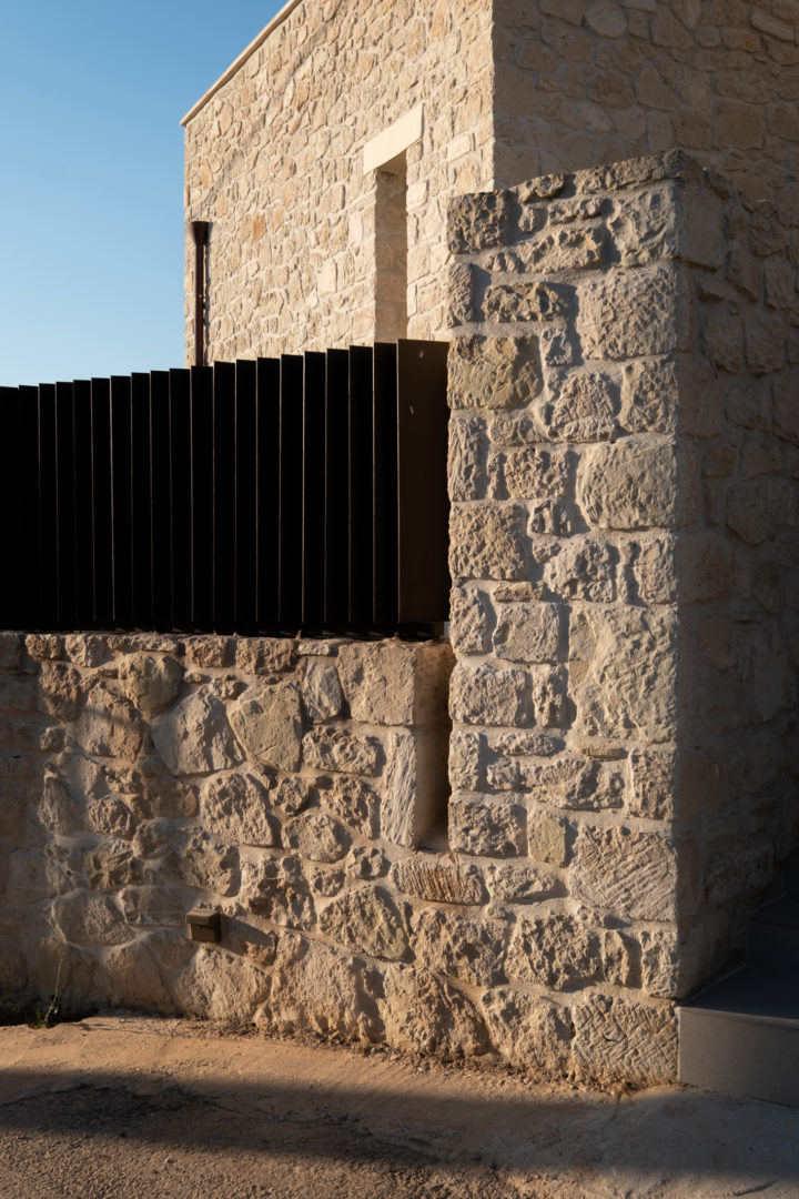 The two-story residence is designed to blend into its surroundings, offering tranquility and balance. The house provides a stunning view of Mount Psiloritis and the Apokoronas landscape, merging nature with architecture. The building consists of two volumes: the first, a two-story structure, houses the private spaces, while the second, a single-story volume, accommodates the common areas. The two-story section is rendered in earthy tones, while the ground floor is clad in local stone, enhancing the connection with local tradition and offering a modern, functional design